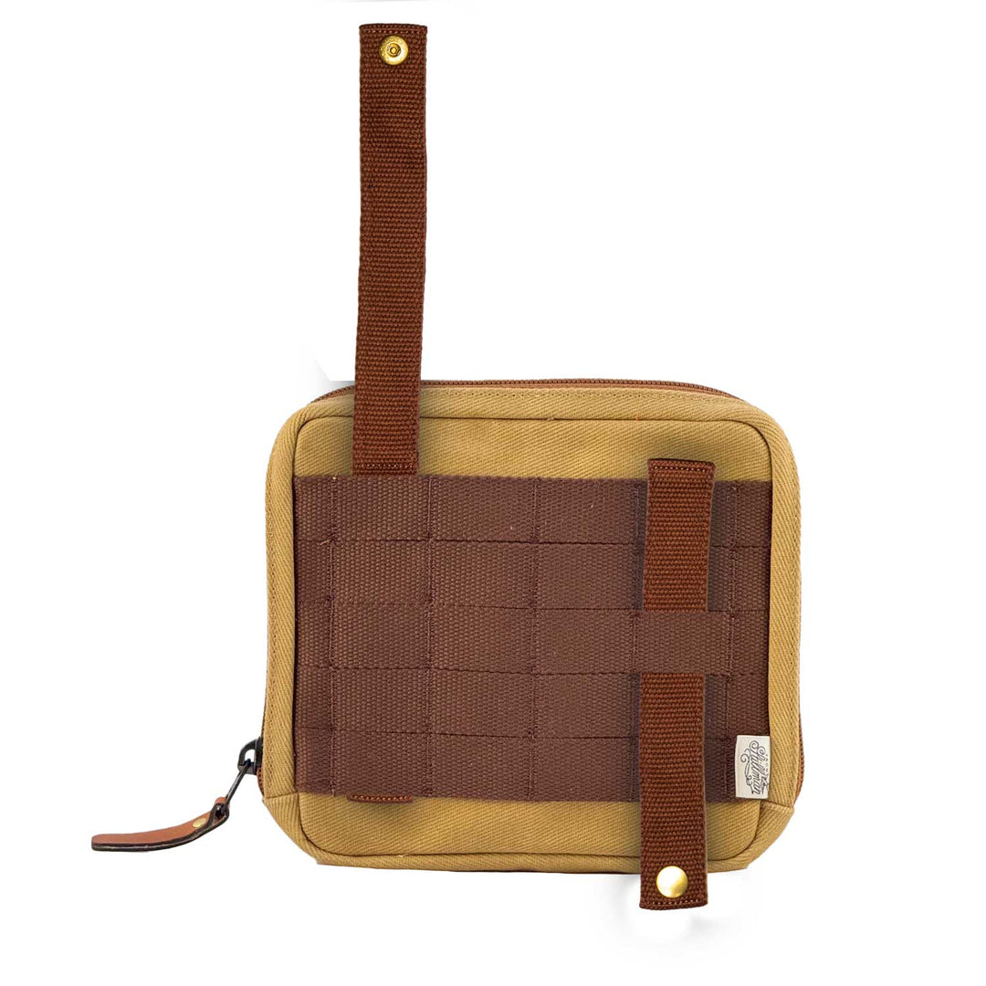 1. Pass the smaller end of one tab underneath the MOLLE loops on either the bag or the pouch.