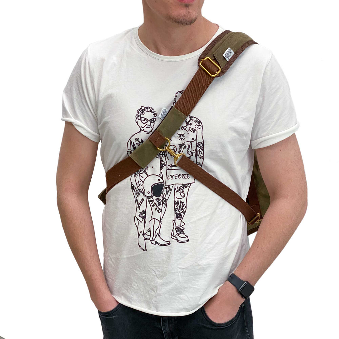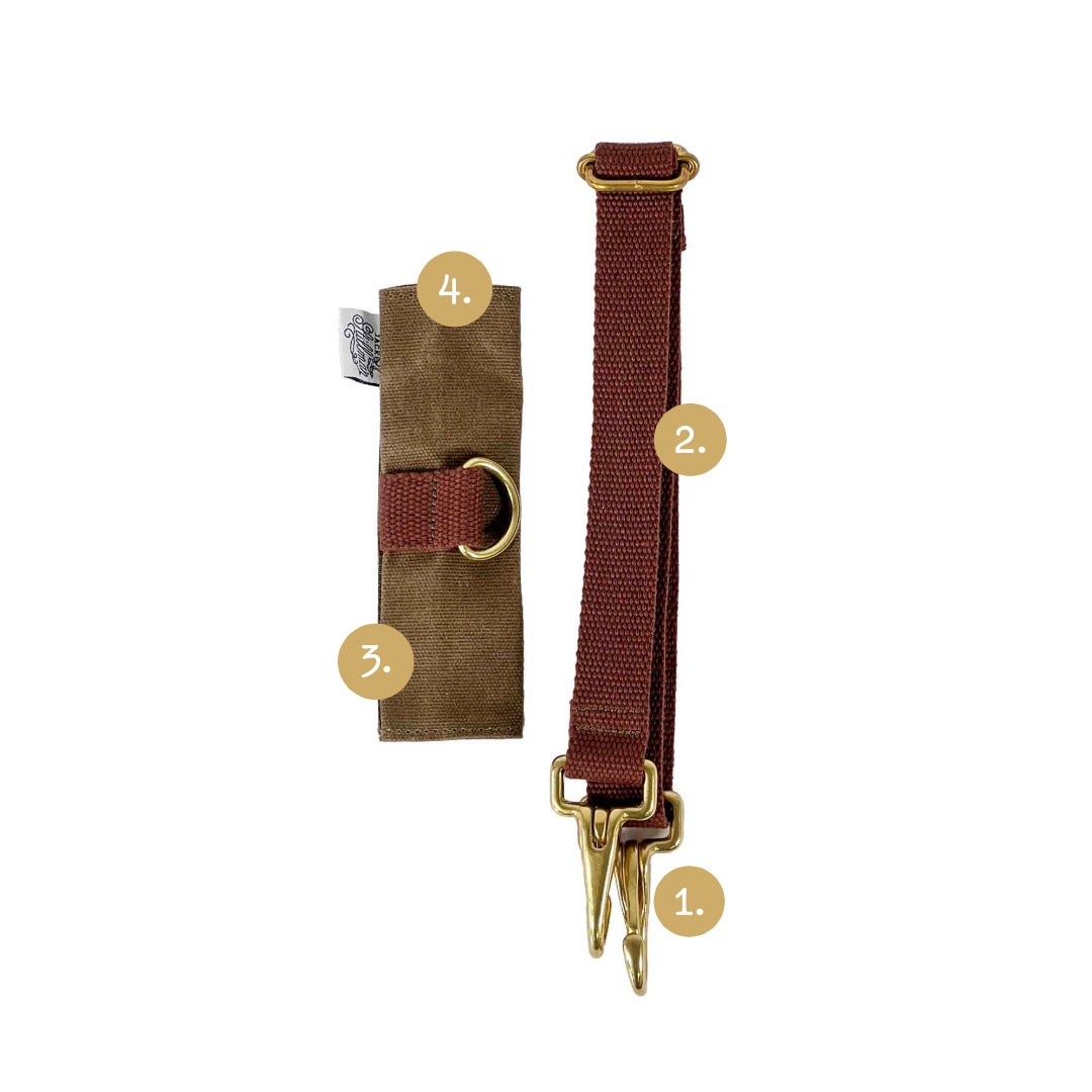 The durable 16oz waxed canvas is reinforced with a solid brass D Ring for added strength. Its adjustable design allows for flexible placement on your shoulder sling, while the cotton webbing belt and solid brass snap hook provide secure attachment to the T Brace. Please note that a base anchor must be present on the bag to attach the other end of the strap, as seen on the Nomad, Commodore, and Trapper bags.