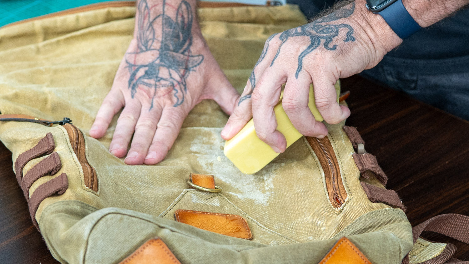 - Lay the item flat on a hard surface and rub the Sack Wax across the fabric fibres. The idea is to get an even covering across the surface.
